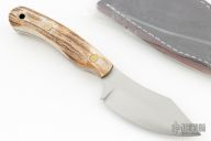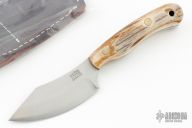 This fixed blade from Bark River Knives features a satin finish blade with .125" blade stock and 1.185" blade depth. The handle is comprised of stag scales with micarta liners over full tang construction. Lanyard bail on pommel. Includes leather sheath and original box. Excellent condition.