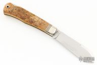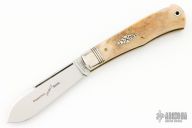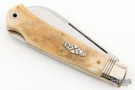 This Trapper by Northfield Knives features a polished blade with nail nick. The handle has nickel silver pinched and fluted bolsters, Bone covers with a nickel silver bullet escutcheon, brass liners/pins.  Comes with original tube. Excellent condition.