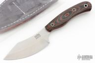 This fixed blade from Bark River Knives features a satin finish blade with .125" blade stock and 1.185" blade depth. The handle is comprised of micarta scales with red G10 liners over full tang construction. Lanyard bail on pommel. Includes leather sheath and original box. Has some patina on the blade, otherwise excellent condition.