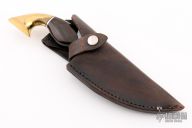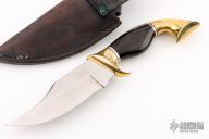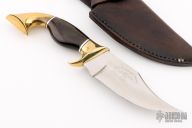 This Stinger Bowie from Iron Mountain Knife Company features a satin finished blade with false top edge, .186" blade stock, 1.658" blade depth, hidden tang construction. The handle has a brass guard and butt, a dymondwood grip black and aluminum spacers handle. This design - which allows you to retain the knife with your hand open/fingers splayed - was patented by Sonny Guiler in 1980 and the knife has the patent number stamped on the back of the blade along with the Beaver logo. Excellent condition. Includes brown leather sheath with belt loop.