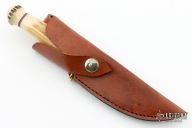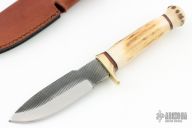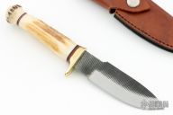 This knife features a blade made from a file and a notched thumbrest, .158" blade stock and 1.142" blade depth, hidden tang construction. The handle has a brass guard, stag grip and stag butt with red/black spacers. Comes with a brown leather sheath. Has some light patina, otherwise excellent condition.