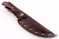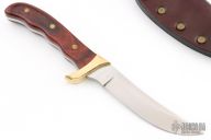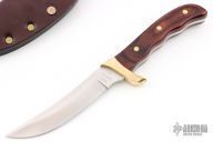 This Akonua by Buck Knives features a satin finished upswept blade, .180" blade stock and .947" blade depth, full tang construction. The handle has a brass guard and dymondwood scales with brass pins. Comes with a brown leather sheath. Has a couple light scratches, otherwise excellent condition.