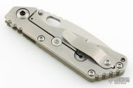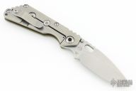 This SNG framelock folder features a stonewashed drop point blade with thumbhole and notched thumbrest. The handle has a green G-10 and a titanium frame with titanium clip, tip up carry. Jimping on blade spine. The G-10 has a diagonal groove pattern. Nice lockup, detent, and blade seating. Excellent condition.