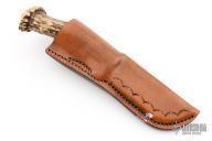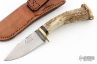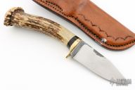 This knife by BL Howard features a hand forged blade with hand rub satin finished grinds and a visible temper liner, .169" blade stock and 1.310" blade depth, hidden tang construction. The handle has a brass guard with crown stag grip and black linen micarta spacer. Comes with a hand tooled brown leather sheath. Has a couple light scratches, otherwise excellent condition.