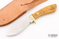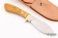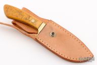 This knife by Palumbo (please let us know if you know who this is) features a mirror polished blade with .181" blade stock and 1.339" blade depth, full tang construction. The handle has a brass guard, yellow paper micarta scales with black liners. Has scrimshaw on both sides. Comes with a brown leather sheath but the keeper is missing the snap. Excellent condition.