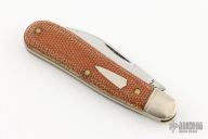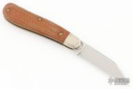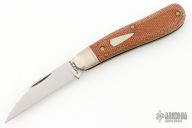 This Coyote by Great Eastern Cutlery features a satin finished blade with nail nick. The handle has pinched and fluted nickel silver bolsters and brass liners, natural canvas covers. Comes with original packaging. Excellent condition.