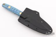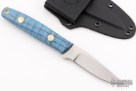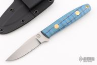 This K-35 by Dozier Knives features a satin finished clip point blade with .125" blade stock and .720" blade depth, full tang construction. The handle has blue curly oak scales with brass pins and lanyard tube. Comes with kydex sheath. New from maker.