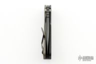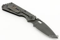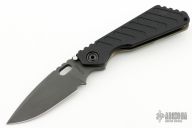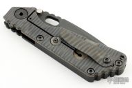 This Mick Strider SNG Fatty framelock folder features a black blade with thumbhole and notched thumbrest. The handle has a black aluminum and a flamed titanium frame with titanium clip, tip up carry. Jimping on blade spine. Nice lockup, detent, and blade seating. Has a few scratches, otherwise good condition.