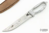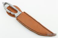 This North African "Bazaar Knife" by Plowshare Forge features a satin finished blade with fileworked spine, .150" blade stock and 1.427" blade depth, hidden tang construction. The handle is made from aluminum with lanyard hole at the butt. Comes with a brown leather sheath. Excellent condition (it is intended to look old and rustic, it is a recreation)