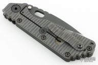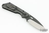 This SMF has a two-tone hand ground drop point blade with notched thumbrest and dual thumbstuds. Handle has Gunner Grip black G-10 and tiger striped titanium scales. Tip up deep carry titanium clip. Has some scuffs and scratches otherwise the knife is in excellent condition.