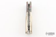 This Lockback Folder by Wayne Whittaker features a Damascus blade with nail nick. The handle has blued Mosaic Damascus bolsters, mammoth ivory scales, fileworked titanium liners, fileworked stainless steel backspacer. Nice blade seating. Comes with a zippered case and COA. New from maker at the Nashville Custom Knife Show 2023.