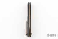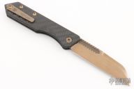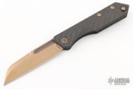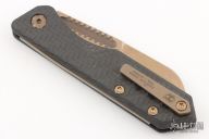This Jinn slipjoint by Heretic Knives features a bronze stonewashed wharncliffe blade with fuller nail nick and a false top edge. The handle has carbon fiber scales with bronze stonewashed stainless steel backspacer and tip up clip, bronzed hardware. Has a lanyard pin at the butt and a black filler tab for the reversible clip. Comes with original box. New from maker!