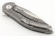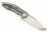 This Bionic 3.0 Framelock Flipper from Brous Blades has a satin blade with fullers and notched thumbrest. The handle has a grey titanium frame with a tip up grey stainless steel clip. Rides on bearings, nice detent, lockup and blade seating. Comes with box and COA. one of 100. New from maker.
