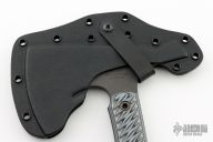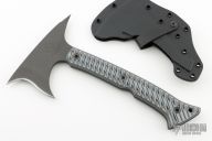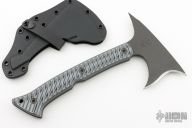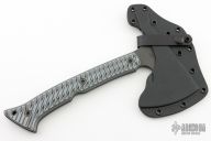 The Graymatter tomahawk offers full tang construction made from 3/16" 80CRV2 carbon steel and has a Cobalt Cerakote finish for increased corrosion and wear resistance. The aggressive head is purpose designed with defensive use in mind. The handle scales offer a contoured 3D texture that works effectively in both wet and dry environments without an overly aggressive feel. The head features a razor sharp, 3” forward facing edge, along with a wicked spike at the rear. The tomahawk includes a bottom eject scabbard with low ride MOC Straps for belt carry. Has light sheathing marks otherwise Excellent Condition.
