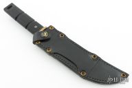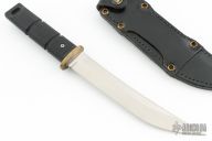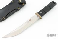 This Model 4004 Shugoto 1 by Al Mar features a satin finished upswept blade, .197" blade stock and 1.118" blade depth, hidden tang construction. The handle has a brass guard, black checkered FRN grip, lanyard hole at the butt. Has some light scratches, otherwise excellent condition. Very hard to find. Comes with black leather sheath.