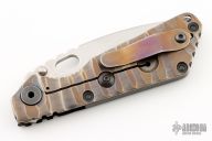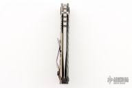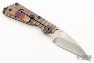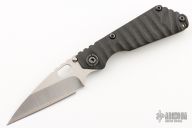 This Custom SnG by Mick Strider features a satin finished wharndliffe blade with tumbled flats, notched thumbrest and a thumbhole. The handle has a textured carbon fiber and anodized titanium frame with matching tip up clip, all black hardware. Nice detent, lockup and blade seating. Comes with zippered case. Has a couple light scratches, otherwise excellent condition.