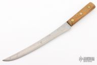 This Foster Bros Knife is made of carbon steel and has .105" blade stock and 1.264" blade depth, full tang construction. The handle has wood scales and brass pins. Has some scratches and patina throughout, good condition for its age.