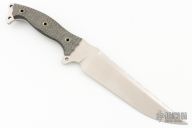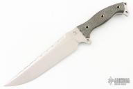 This Custom Shop Urgent Fury by Busse features a satin finished blade with serrated and sharpened spine, .217" blade stock and 1.847" blade depth, full tang construction. The handle has black canvas micarta scales, extended tang with lanyard hole. Excellent condition.