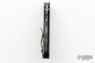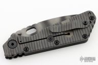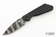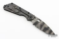 This Mick Strider SMF Fatty framelock folder features a tiger striped tanto blade with thumbhole and notched thumbrest. The handle has a black aluminum and flamed titanium frame with titanium clip, tip up carry. Jimping on blade spine. Nice lockup, detent, and blade seating. Excellent condition.