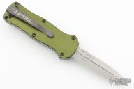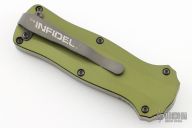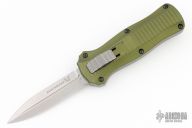 This Mini-Infidel by Benchmade features a stonewashed, double edge dagger style blade with fullers. The handle has an anodized aluminum frame, ramped steel thumb slide and steel tip down clip. Includes original box and nylon sheath. Excellent condition.