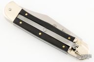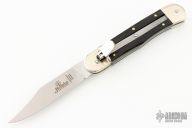 This leverlock auto by Hubertus features a mirror polished clip point blade, nickel silver double bolsters, ebony scales, and brass liners and pins. Opens with a nice snap. Very fast opening. Comes with original box. New condition.