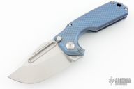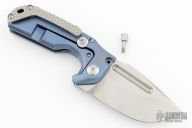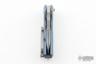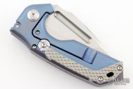 This knife features a stonewashed clip point blade with a notched thumbrest.  The handle has anodized titanium frame with a tip down titanium pocket clip.  Includes a pin that locks the knife in the open position. Includes a padded zippered case.  Excellent Condition.