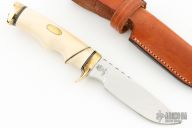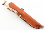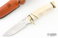 This knife by Ruffin Johnson features a mirror polish blade with fileworked spine, .179" blade stock, 1.098" blade depth, hidden tang construction. The handle has a brass guard and butt, walrus ivory grip with black/white/brass spacers. Comes with a brown leather sheath and a zippered case. Wolf logo onset on butt. Has some patina and light scratches, has some stabilized cracks in the handle, otherwise good condition.