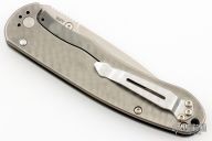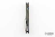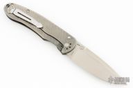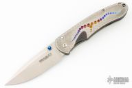 This Alias 1 by Bradley Cutlery Co. features a stonewashed spear point blade with single anodized thumbstud, false top edge and notched thumbrest. The handle has a titanium frame with stainless steel clip. The handle has been customized by Will Moon. Jeweled, milled and custom anodized. Nice detent, lockup and blade seating. Has some scuffs, good condition. Inside of the scale reads "Braley Alias 1 "Ozganica" #3 Will Moon Handmade August 2011 NC USA"