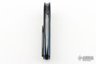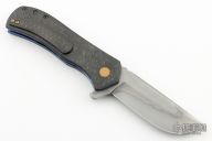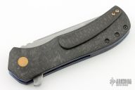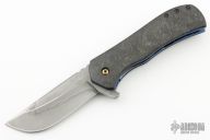 This Recon Flipper by Doc Shiffer features a hand rub satin finished blade with nice hamon, flipper and fileworked thumbrest. The handle has marble carbon fiber scales, anodized and scratch pattern finished titanium liners, marble carbon fiber backspacer, tip up carbon fiber clip. Rides on bearings, nice detent, lockup and blade seating. Has a couple scratches, otherwise excellent condition.