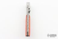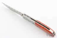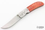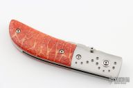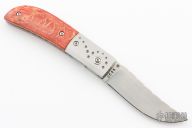 This Linerlock by Steve Jernigan features a hand rub satin finished blade with fileworked spine and single thumbstud, stamped "CC25" on B-side of ricasso. The handle has dovetailed stainless steel bolsters, tiger coral scales, stainless steel liners and backspacer. Nice detent, lockup and blade seating. Very smooth and classy little knife. Comes with a felt pouch. Excellent condition. Made in 1980