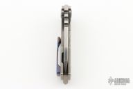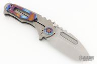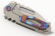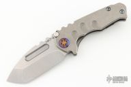 This Micro Praetorian from Medford Knife and Tool features a satin finished drop point blade with notched thumbrest and fullers. The handle has a stonewashed titanium frame with an anodized titanium tip up pocket clip. Stainless steel backspacer doubles as a glass breaker. Comes with original hard case and papers dated September 09, 2022. Excellent condition.