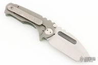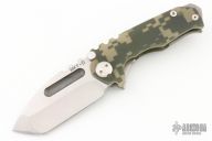 The Micro Praetorian from Medford Knife and Tool features a satin/tumble finished blade made from D2 steel with fuller/thumb grooves and a notched thumbrest. The handle has a camo G-10 and a tumbled titanium lockside over a steel backspacer/glass breaker. Tumbled finished tip up pocket clip.Nice detent, lockup and blade seating. Includes original box, plastic vault style case and papers. Has been resharpened. Has some light scuffs otherwise the knife is in excellent condition.