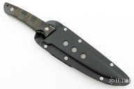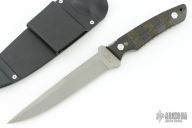 This fighter by Kevin L Hoffman features a double edged bead blast finished blade with .198" blade stock and 1.105" blade depth, full tang construction with black linen micarta scales. Comes with a kydex sheath. Has some scuffs, otherwise excellent condition.