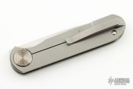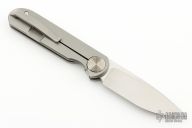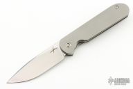 This Shamwari, by Gareth Bull, features a satin finished drop point blade with notched thumbrest and front flipper. The handle has a bead blasted titanium frame with matching tip up clip and anodized titanium barrel spacer and pivot collar. Includes a padded zippered case.  Excellent condition.