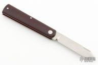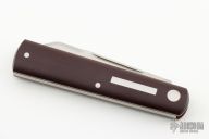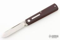 This slipjoint from Jared Oeser features a hand rub satin finished blade with nail nick. The handle has micarta covers over micarta liners, stainless steel spring. Has half-stop, flush in all positions. Comes with original box, COA dated 6-22-17 and brown leather slip sheath.  Excellent condition.