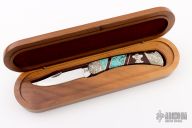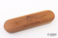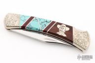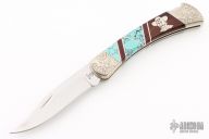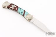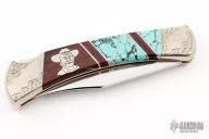 This Buck Model 110 has been customized by Brian Yellowhorse. The blade features a mirror polished clip point blade with a nail nick. The handle features a nickel silver frame with multi piece scales. Includes original display box and COA. Excellent condition. #122/500