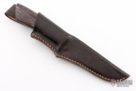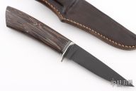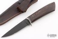 This knife by Moonshine Knives features a black blade with .143" blade stock and 1.006" blade depth, hidden tang construction. The handle has a stainless steel guard with black/stainless spacers, crazy linen micarta grip. Comes with a black leather sheath. New from maker!