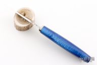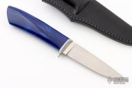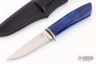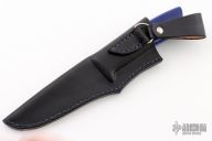 This knife by Moonshine Knives features a hand rub satin finished blade with .137" blade stock and 1" blade depth, hidden tang construction. The handle has a textured stainless steel guard with black/stainless spacers, blue Juma grip. Comes with a black leather sheath. New from maker!