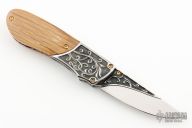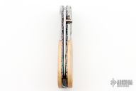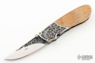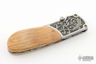 This knife by Suchat Jangtanong features a mirror polished blade with carved ricasso and a single diamond inlaid thumbstud. The handle has carved stainless steel bolsters, mammoth ivory scales, fileworked and anodized titanium liners and backspacer with dimaond inlays, gold plated screws. Comes with zippered case and COA dated May 05, 2013. Nice lockup and blade seating. Very impressive work. Excellent condition.