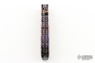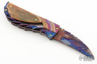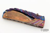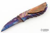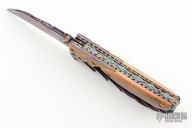 This knife by Suchat Jangtanong features a blued Mosaic Damascus blade with carved spine and a single ruby inlaid thumbstud. The handle has carved titanium bolsters, mammoth ivory scales and high carbon Damascus, fileworked and anodized titanium liners and backspacer with stone inlays, gold plated screws. Comes with zippered case and COA dated May 20, 2014. Nice lockup and blade seating. Very impressive work. Excellent condition.