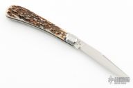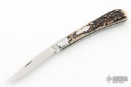 This Trapper by Reese Bose features a hand rub satin finished blade with a nail nick. The handle has stainless steel bolsters, stag covers, stainless steel liners, spring and shield. Half stop on blade, flush in all positions. Excellent fit and finish. Excellent Condition.