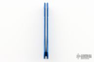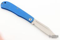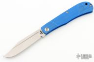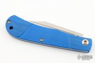 This Slipjoint by Nick Swan features a blasted blade with fullers. The handle has blue G-10 covers with stainless steel backspacer with lanyard hole. Has half-stop, flush in all positions. Excellent condition.