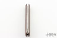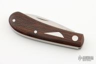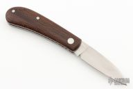 This Mini Zulu slipjoint by Nick Timpson of Birdvis Knives features a hand rub satin finished blade with nail nick. The handle has cross cut brown canvas micarta covers, grey liners, jeweled stainless steel liners and spring. Has half-stop, flush in all positions. Excellent condition.