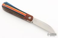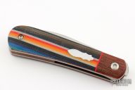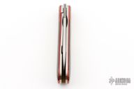 This Swayback Front Flipper by Enrique Pena features a hand rub satin finished wharncliffe blade with swedge, notched thumbrest and front flipper. The handle has brown canvas micarta bolsters, canvas micarta scales over red liners, natural canvas micarta backspacer. Satin finished titanium liners and a stainless steel shield. Excellent condition.