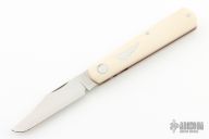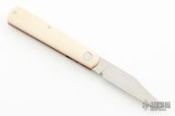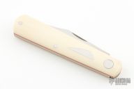 This barlow slipjoint by Nick Timpson of Birdvis Knives features a hand rub satin finished blade with nail nick. The handle has ivory G-10 covers, orange G-10 liners, stainless steel liners, escutcheon and spring. Has half-stop, flush in all positions. Excellent condition.