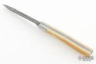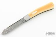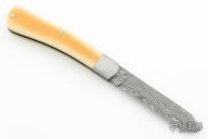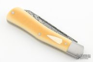 This slipjoint by Jeffery Mitchell features a Damasteel blade with long pull. The handle has stainless steel bolsters and liners, Westinghouse yellow paper micarta covers, Damasteel spring, has half-stop, flush in all positions. Excellent condition.