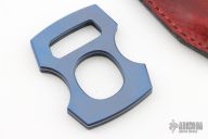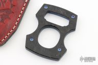 The Contra Cypop is a first for the BRNLY Brand. This two-piece Cypop bottle opener is crafted from two materials, fat carbon on the front and stonewashed and anodized titanium on the back. The two pieces are held together with blue titanium hardware. Comes with a brown leather sheath. Excellent condition.