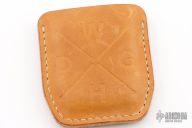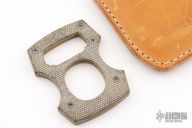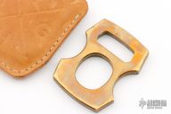 This two-piece Cypop bottle opener is crafted from two materials, OD Canvas Micarta on the front and tumbled brass on the back. The two pieces are held together with blasted finished titanium hardware. Has some patina, otherwise excellent condition. Comes with a brown leather sheath.