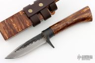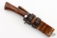 This knife features a two-tone San Mai Damascus blade with fullers and a hidden tang construction, .172" Blade Stock.  .890" Blade Depth.  The handle features an iron clad guard and a wood grip.  Includes a matching wood saya.  Excellent Condition.  Comes with original box.