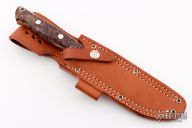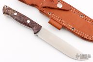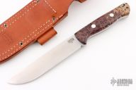 This Bravo 1.5 from Bark River features a satin finished blade and stabilized box elder burl scales. Full tang construction with .219" blade thickness and 1.158" blade depth. Notched thumbrest. Includes brown leather sheath with belt loop. Excellent condition.